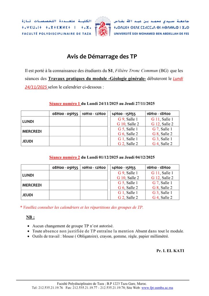 Avis de Démarrage des TPs (Géologie générale), TC_BG, S1