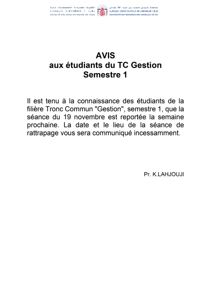 Avis aux étudiants du TC-Gestion, Semestre 1