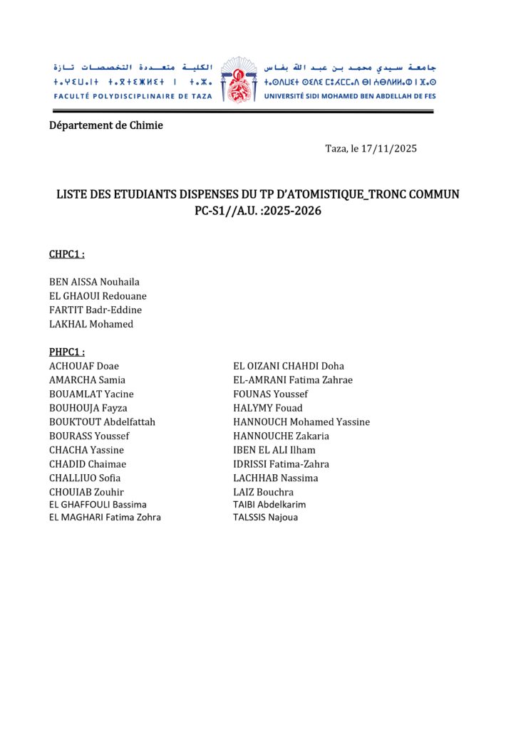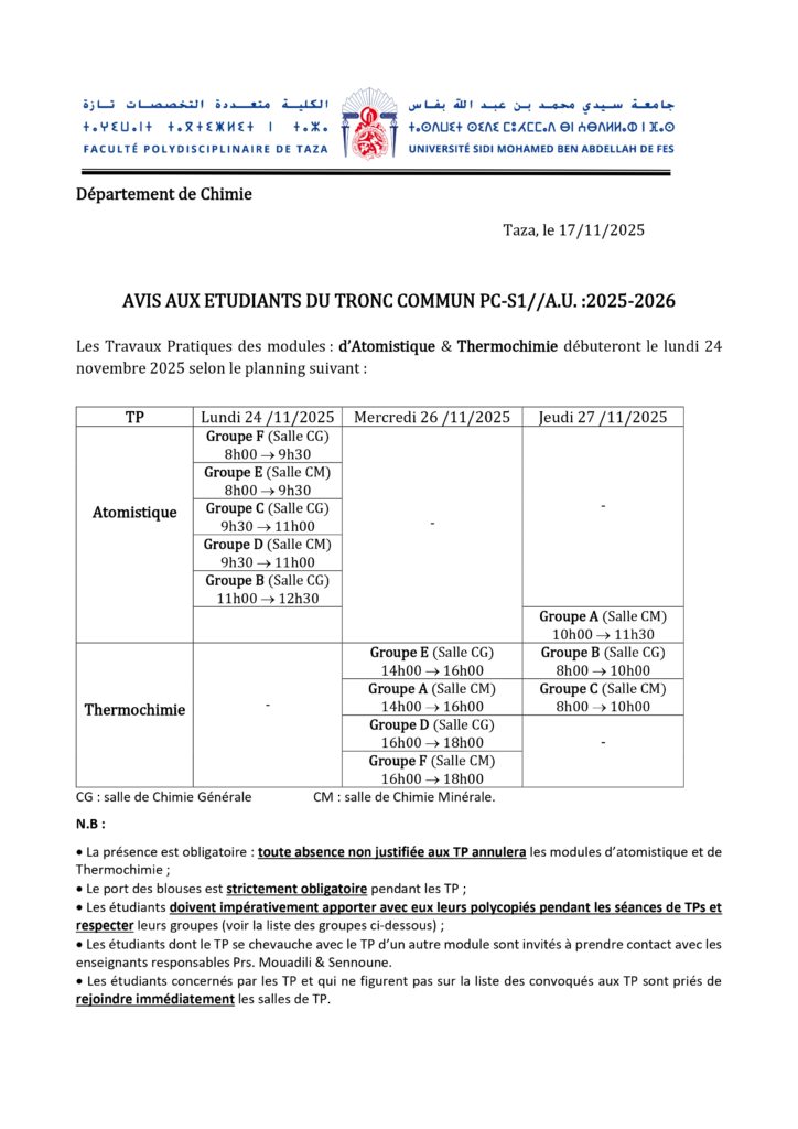 AVIS AUX ETUDIANTS DU TRONC COMMUN PC-S1//A.U. :2025-2026