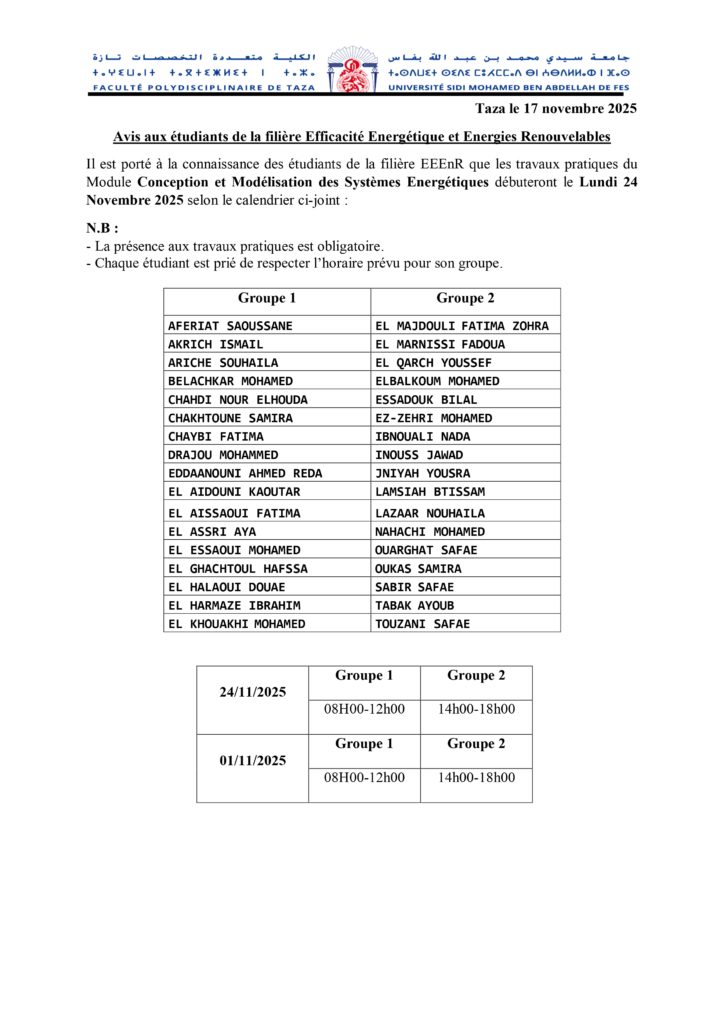 Avis aux étudiants de la filière Efficacité Energétique et Energies Renouvelables des travaux pratiques du Module Conception et modélisation des systèmes énergétiques