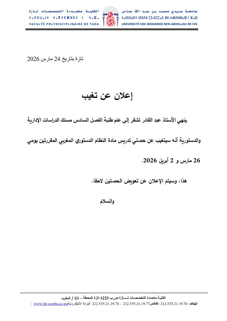 إعلان لطلبة الفصل السادس مسلك الدراسات الإدارية والدستورية – وحدة النظام الدستوري المغربي