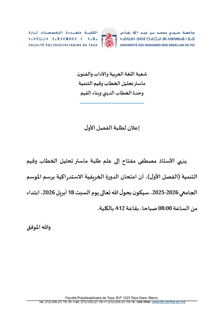 إعلان لطلبة ماستر تحليل الخطاب وقيم التنمية الفصل الأول وحدة الخطاب الديني وبناء القيم