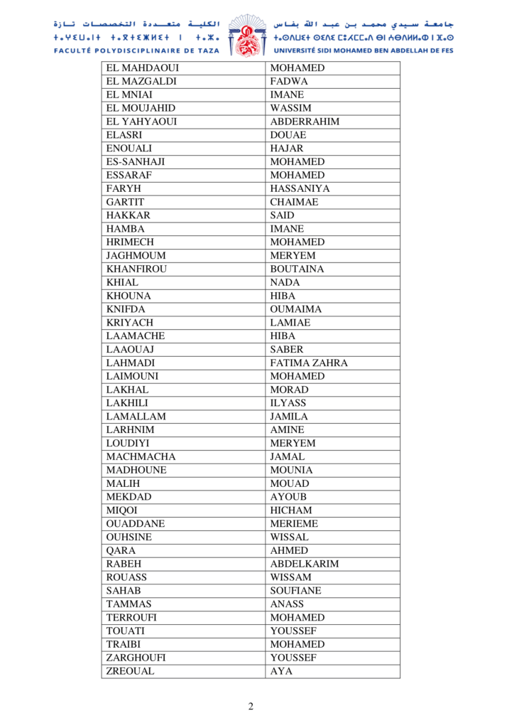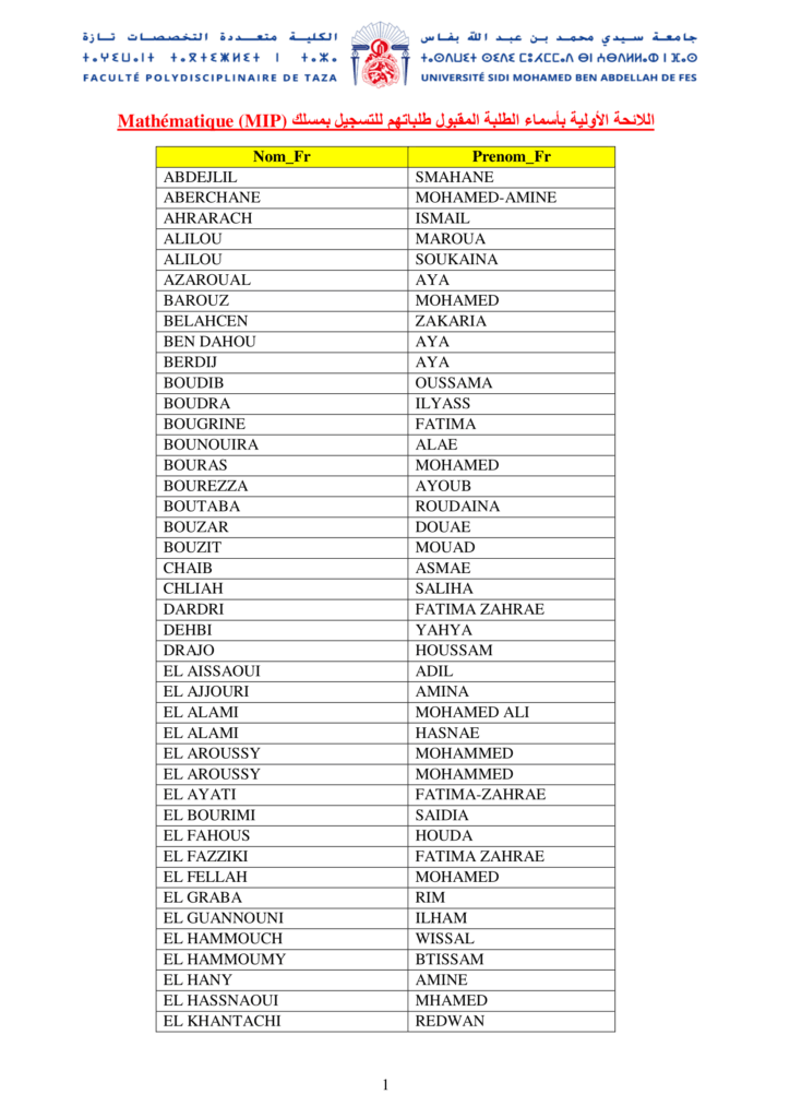 اللائحةالأولية بأسماء الطلبة المقبول طلباتهم للتسجيل بمسلك Mathématique (MIP)
