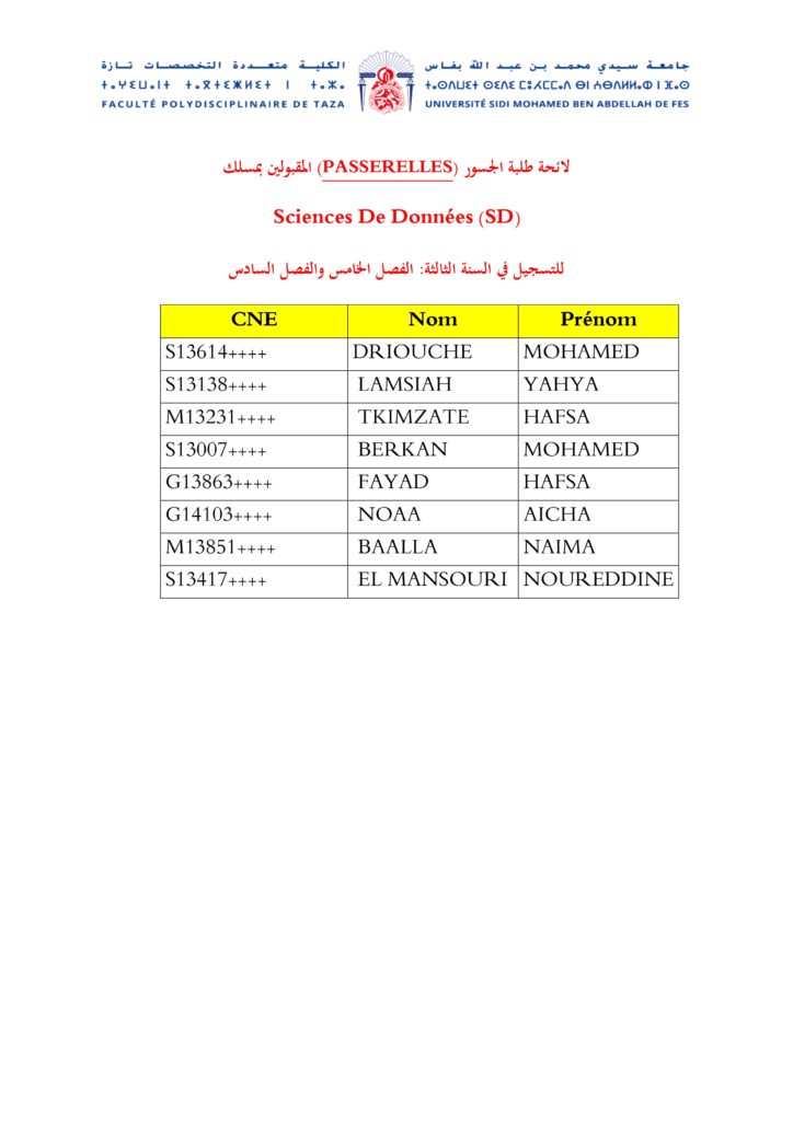 لائحة طلبة الجسور (PASSERELLES) المقبولين بمسلك Sciences De Données (SD) للتسجيل في السنة الثالثة: الفصل الخامس والفصل السادس