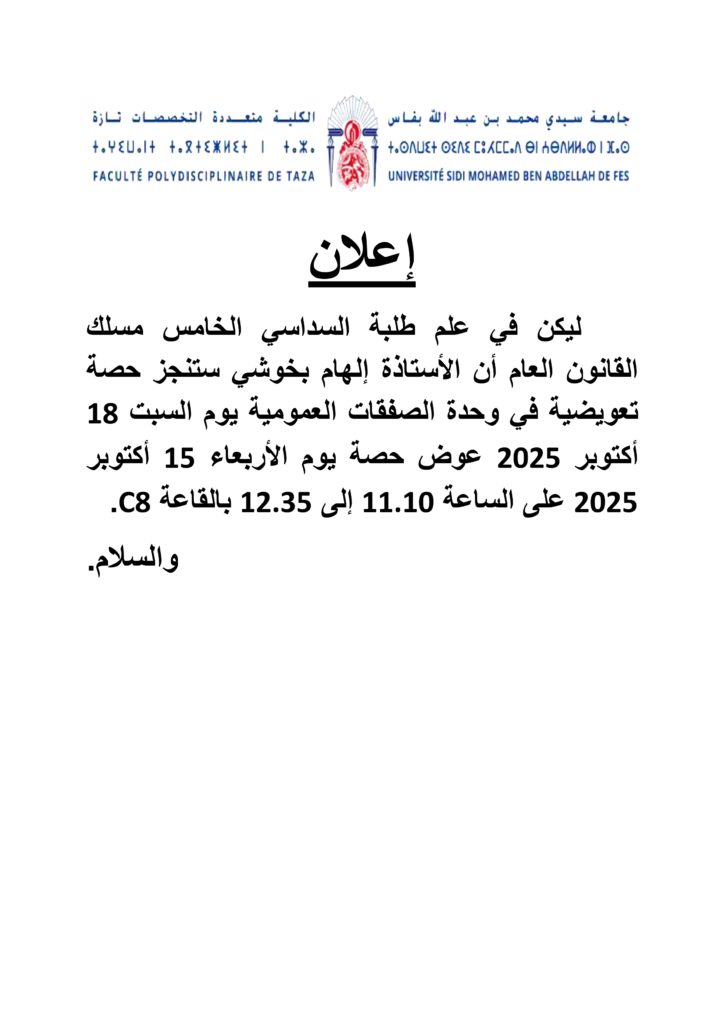 إعلان عن حصة تعويضية لطلبة السداسي الخامس مسلك القانون العام – وحدة الصفقات العمومية