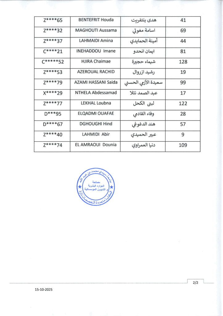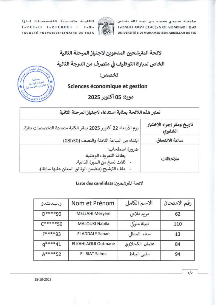 لائحة المترشحين المدعوين لاجتياز المقابلة الشفوية لمباراة توظيف متصرف من الدرجة الثانية في تخصص Sciences économiques et Gestion  لدورة 05 أكتوبر 2025.