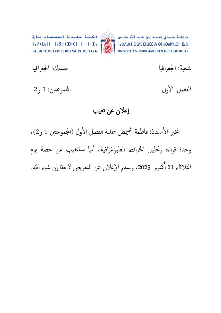إعلان لطلبة الفصل الأول (المجموعتين 1 و 2) ، وحدة قراءة وتحليل الخرائط الطبوغرافية، شعبة الجغرافيا