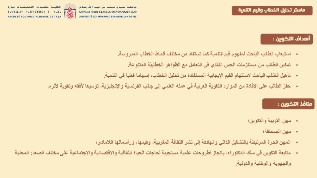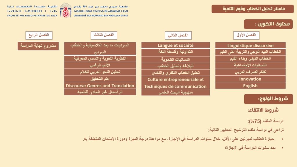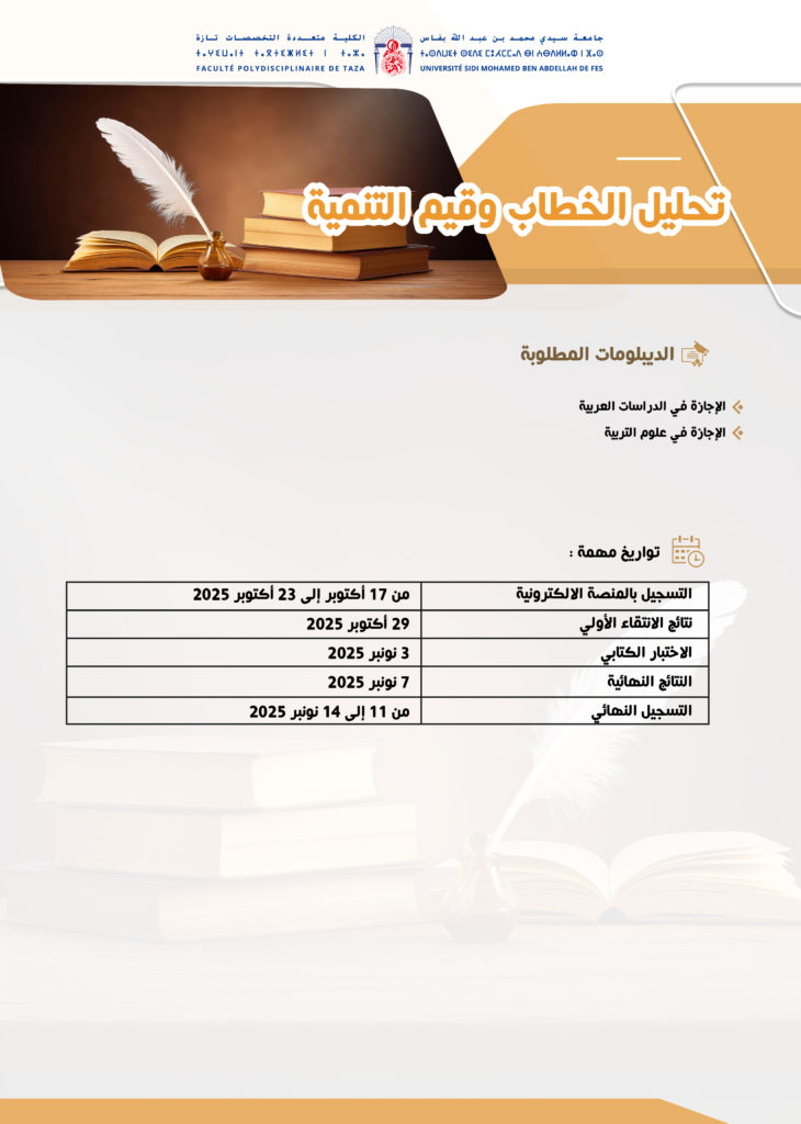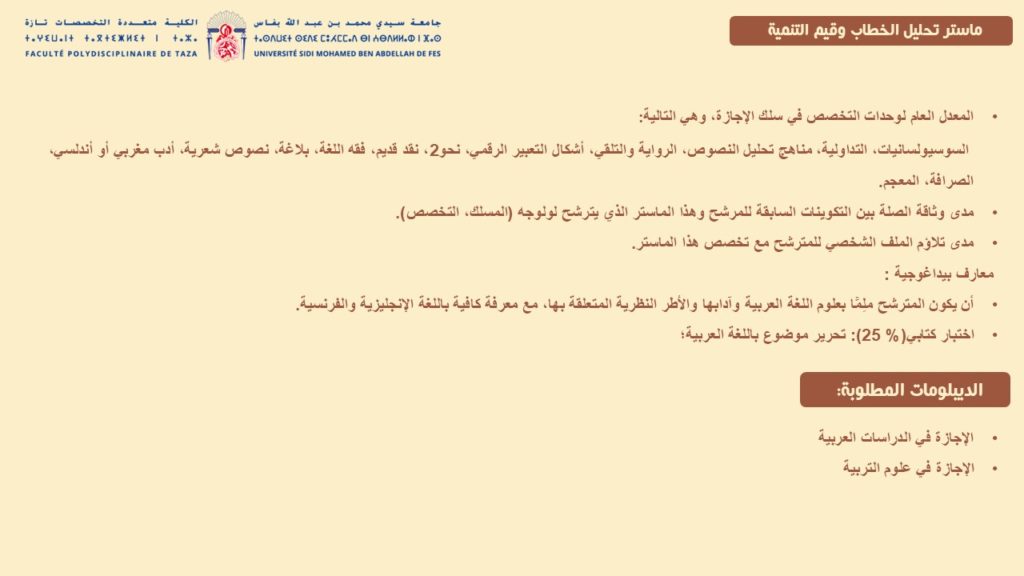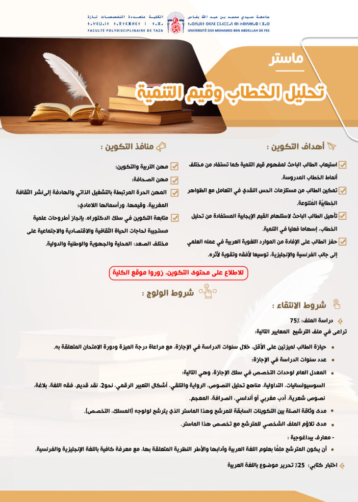 يمكنكم التسجيل في ماستر تحليل الخطاب وقيم التنمية على الرابط التالي : رابط منصة التسجيل