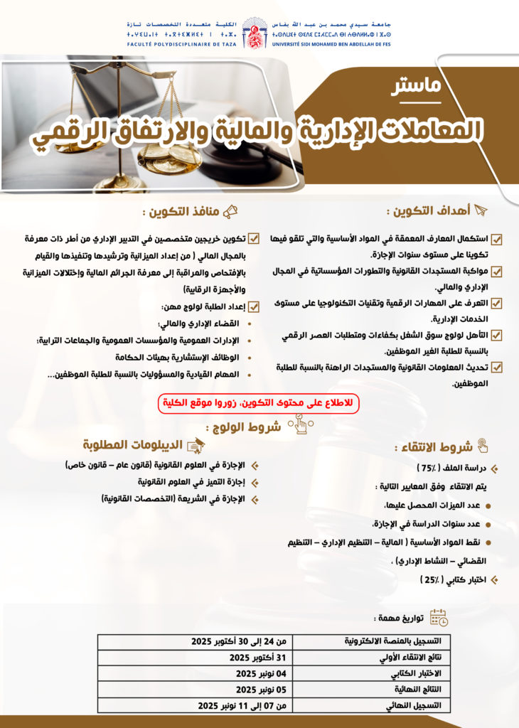 يمكنكم التسجيل في ماستر المعاملات الإدارية والمالية والارتفاق الرقمي على الرابط التالي : رابط منصة التسجيل