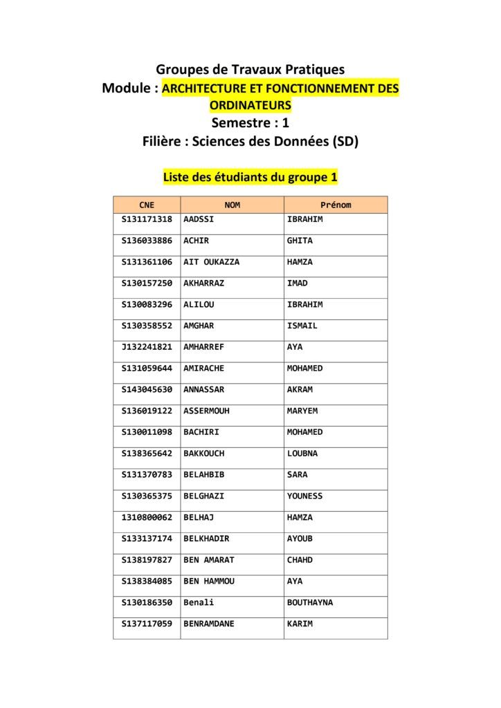 Groupes de TP Module : ARCHITECTURE ET FONCTIONNEMENT DES ORDINATEURS Semestre1 Filière : Sciences des Données (SD)