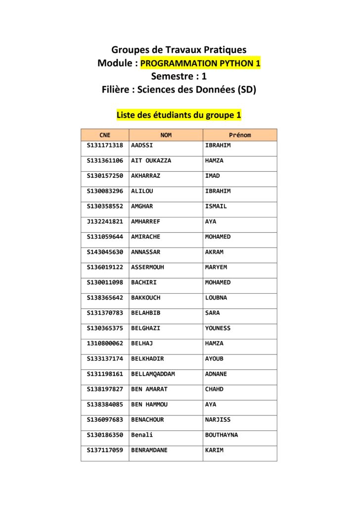 Groupes de TP Module : PROGRAMMATION PYTHON 1 Semestre1 Filière : Sciences des Données (SD)