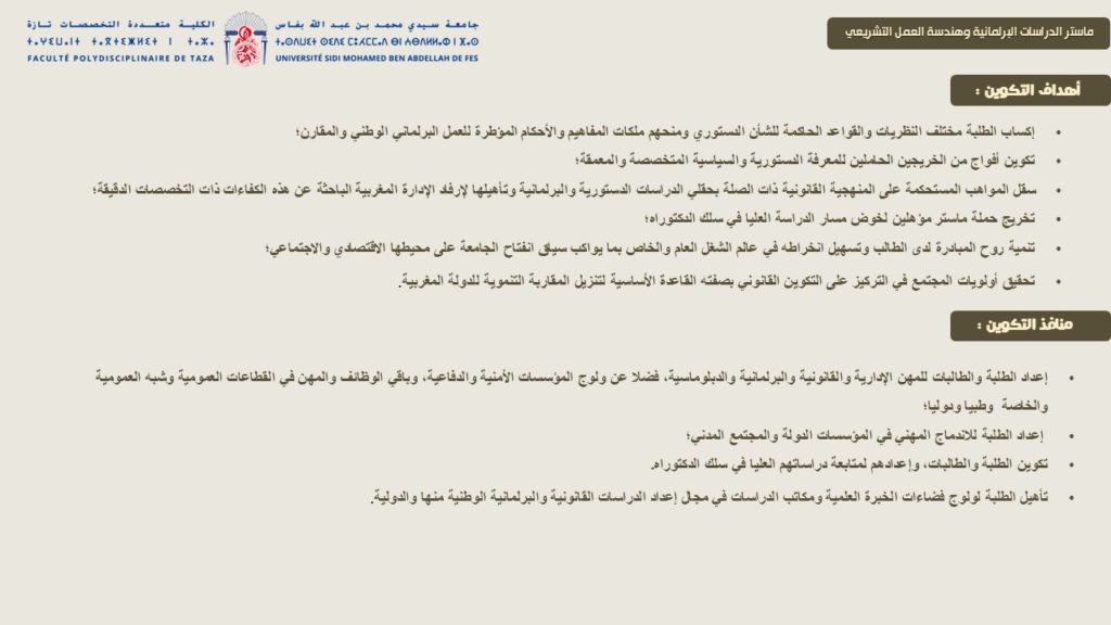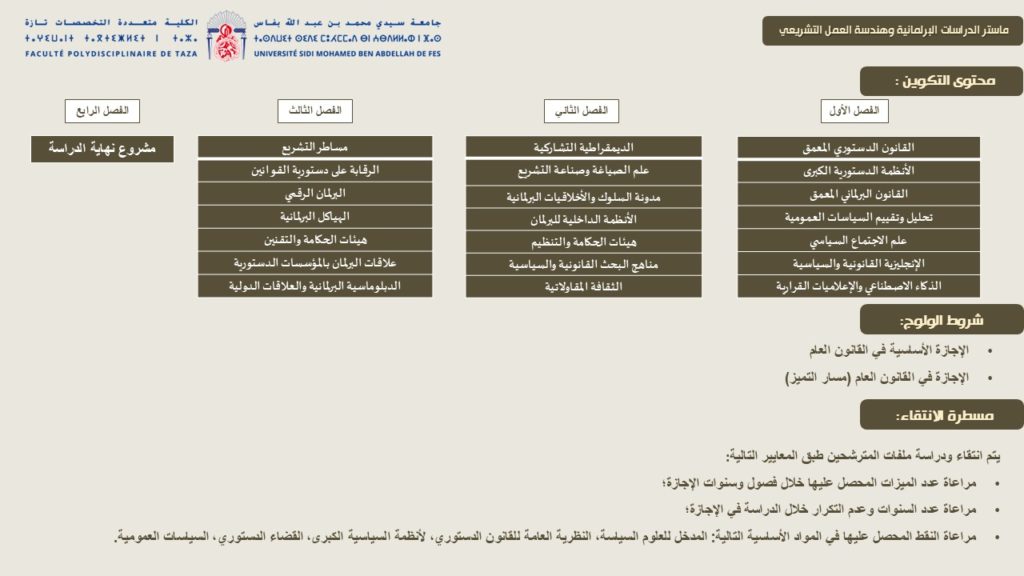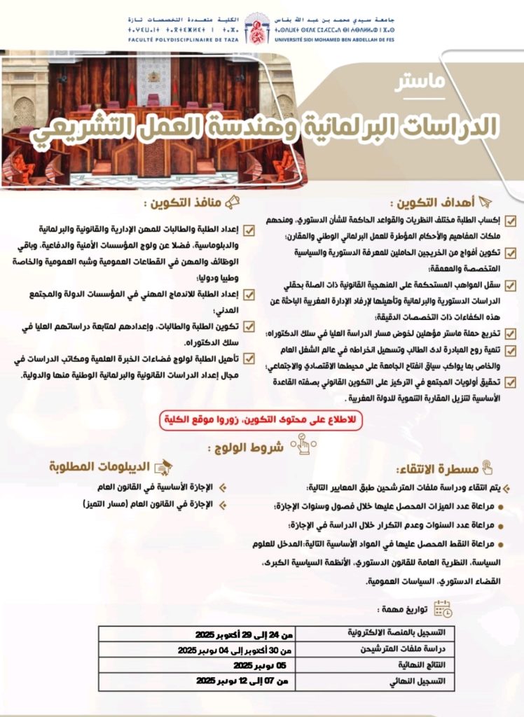 يمكنكم التسجيل في ماستر الدراسات البرلمانية وهندسة العمل التشريعي على الرابط التالي : رابط منصة التسجيل