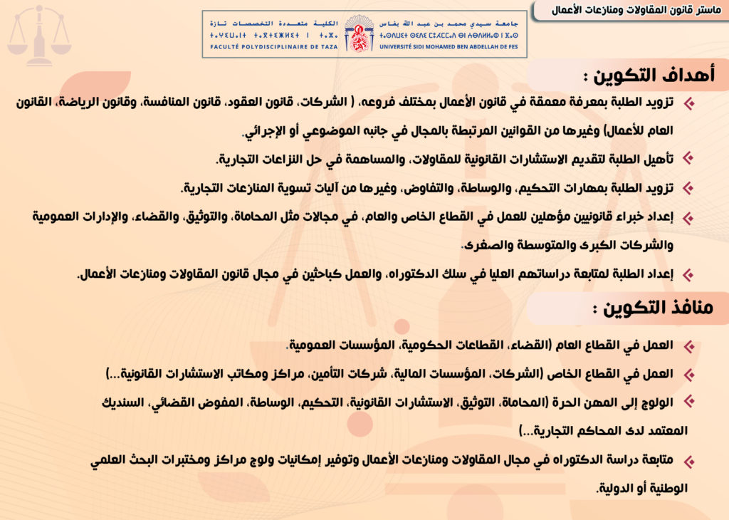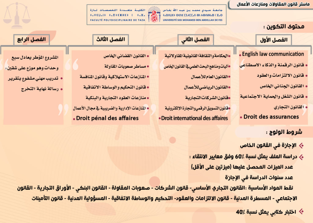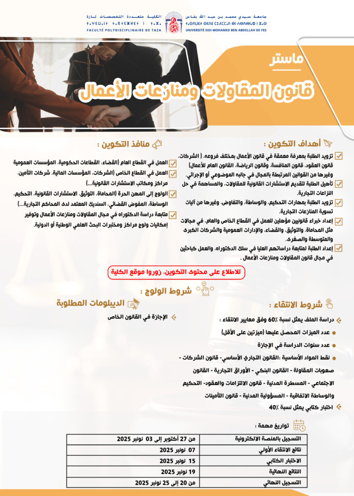 يمكنكم التسجيل في ماستر قانون المقاولات ومنازعات الأعمال على الرابط التالي : رابط منصة التسجيل