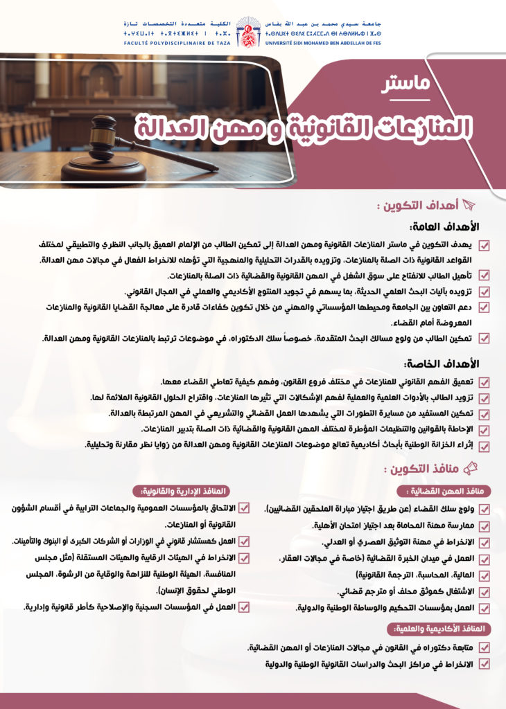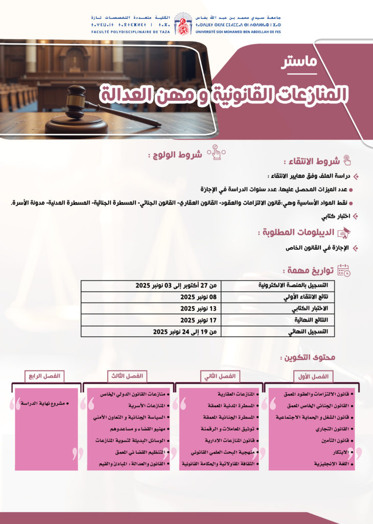 يمكنكم التسجيل في ماستر المنازعات القانونية ومهن العدالة على الرابط التالي : رابط منصة التسجيل