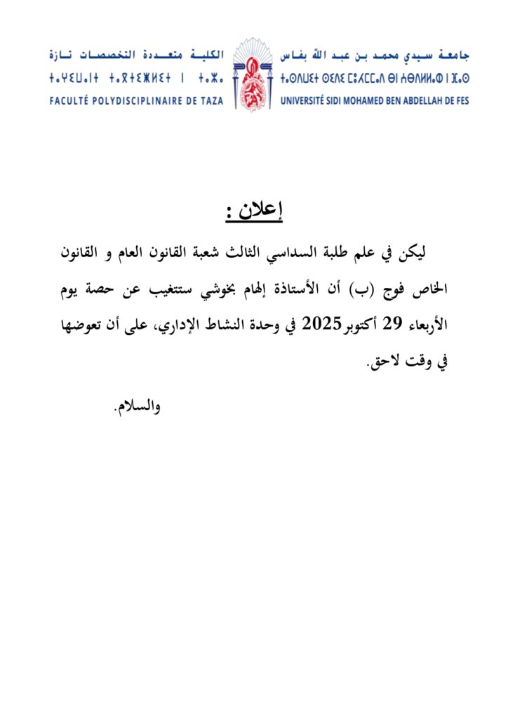 إعلان لطلبة السداسي الثالث – القانون العام والقانون الخاص – فوج (ب) – وحدة النشاط الإداري