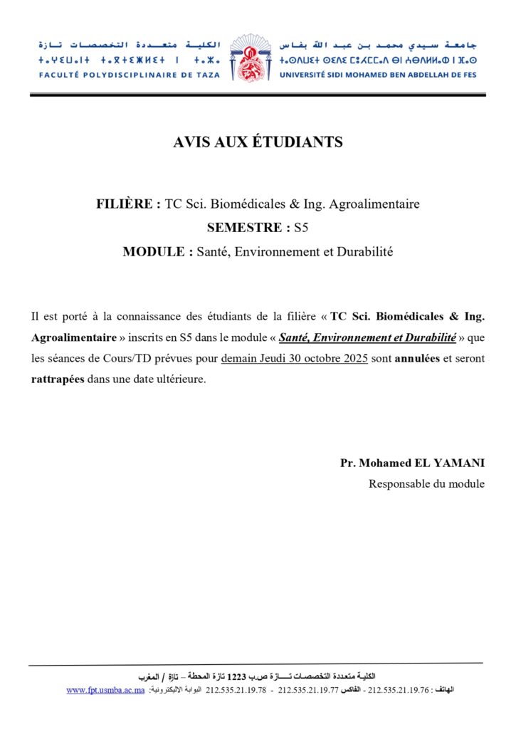 Avis aux étudiants de la filiére TC Sci.Biomédicales & Ing.Agroalimentaire S5 Module : Santé, Environnement et Durabilité