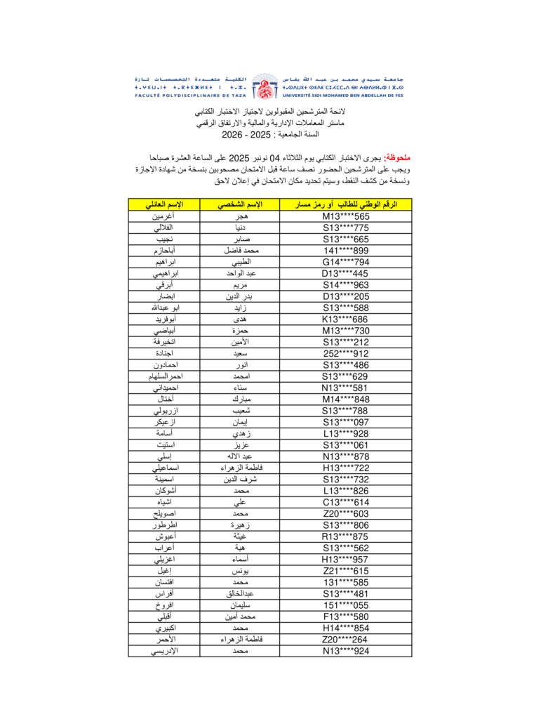 لائحة المترشحين المقبولين لاجتياز الاختبار الكتابي لماستر المعاملات الإدارية والمالية والارتفاق الرقمي