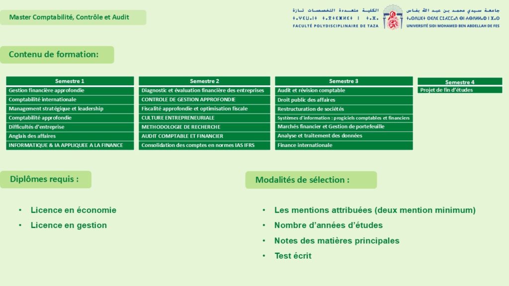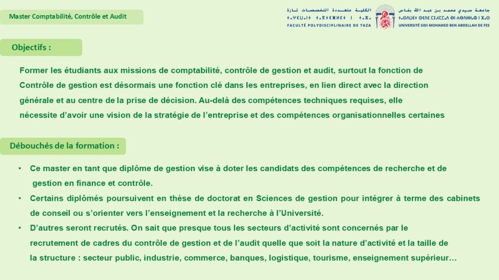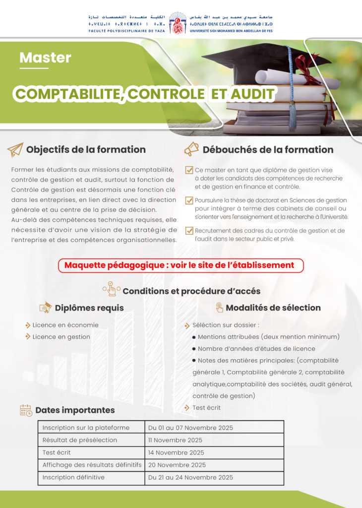 Pour vous inscrire au Master Comptabilité, Contrôle et Audit, veuillez cliquer sur le lien suivant : Lien d’inscription