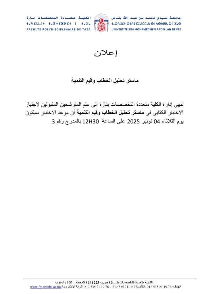 إعلان هام بخصوص الاختبار الكتابي لماستر تحليل الخطاب وقيم التنمية