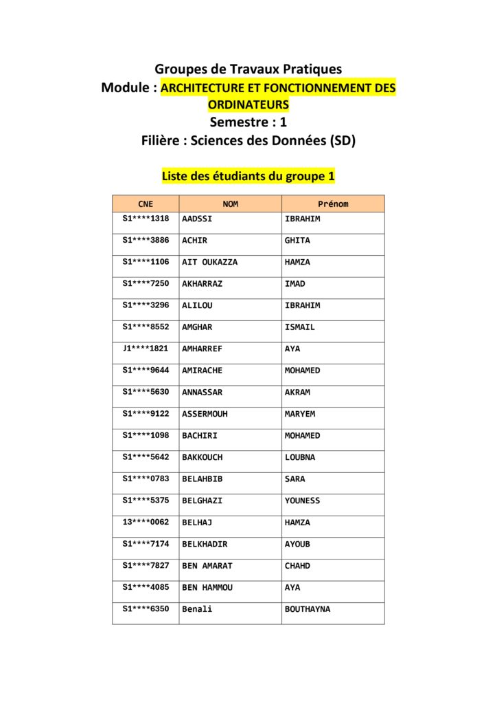 Groupes de TP Module : ARCHITECTURE ET FONCTIONNEMENT DES ORDINATEURS Semestre1 Filière : Sciences des Données (SD)
