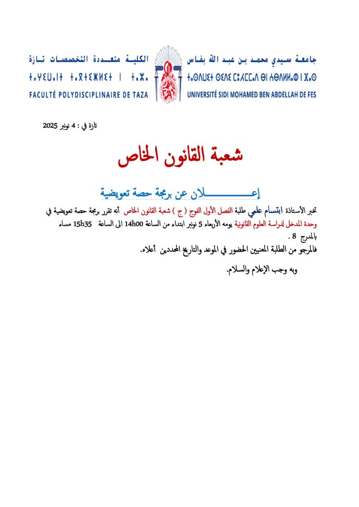 إعلان لطلبة ببرمجة حصة تعويضية الفصل الأول – فوج ج – شعبة القانون الخاص – وحدة المدخل لدراسة العلوم القانونية