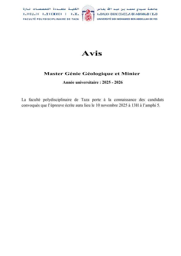 Test Ecrit (Master Génie Géologique et Minier ) – Année universitaire : 2025 – 2026