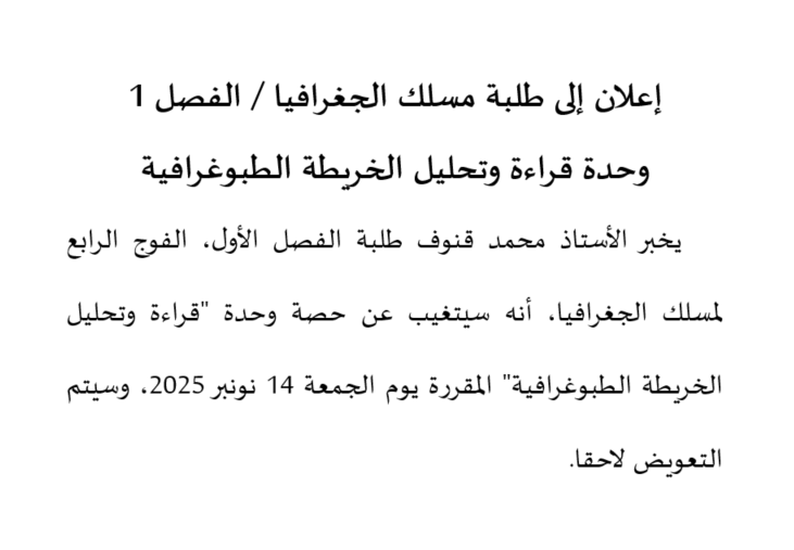 إعلان لطلبة مسلك الجغرافيا / الفصل 1 – وحدة قراءة وتحليل الخريطة الطبوغرافية