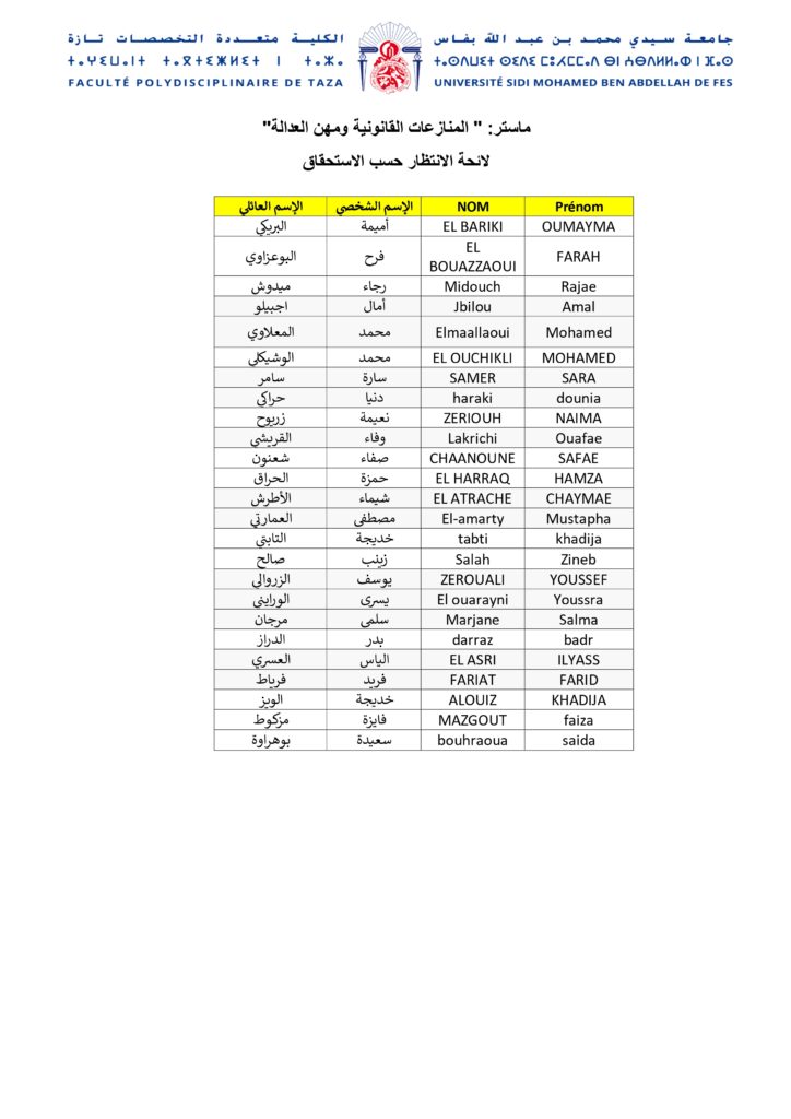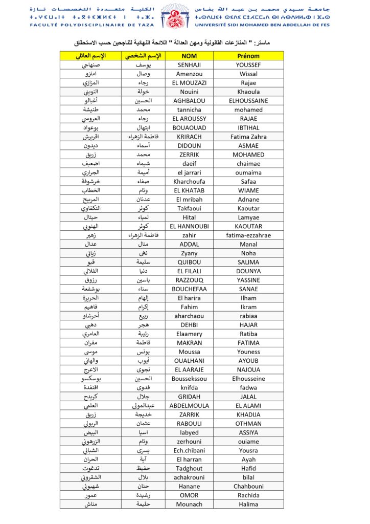 ماستر « المنازعات القانونية ومهن العدالة  » لائحة النهائية للناجحين حسب الاستحقاق