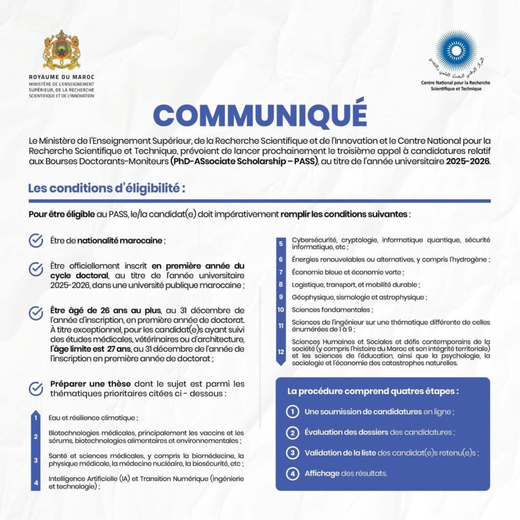 Lancement du 3ᵉ Appel à Candidatures pour les Bourses Doctorants-Moniteurs (PhD-ASsociate Scholarship – PASS), au Titre de l’Année Universitaire – 2025/2026