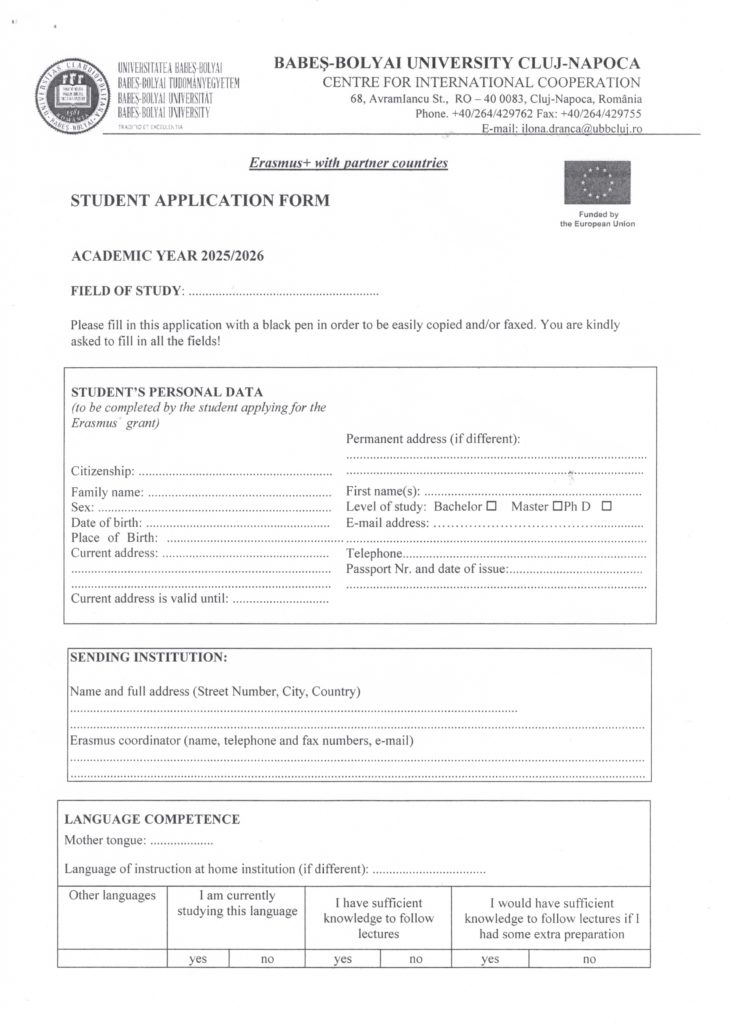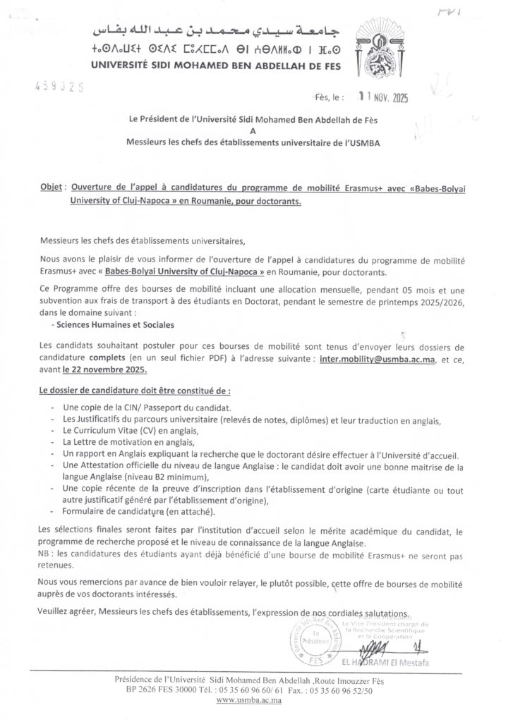 Ouverture de l’appel à Candidatures du Programme de Mobilité Erasmus + avec « Babes-Bolyai Univerty of Cluj-Napoca » en Roumanie, pour Doctorants.