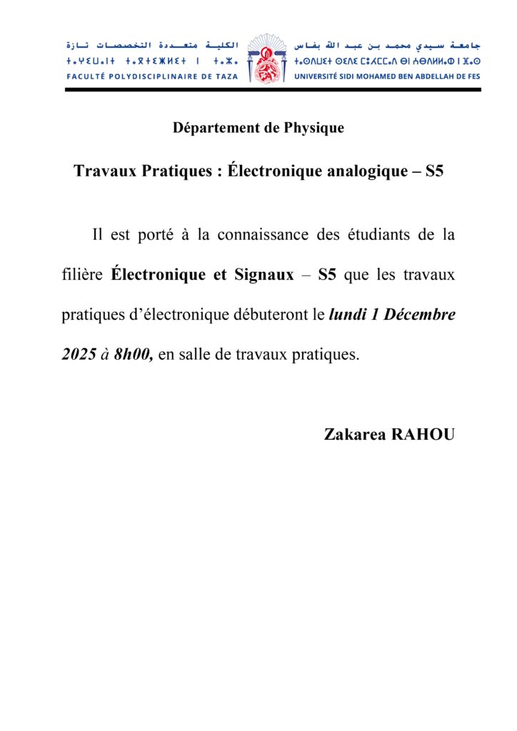 Avis aux étudiants de la filière Électronique et Signaux – Travaux Pratiques d’Électronique Analogique (S5)