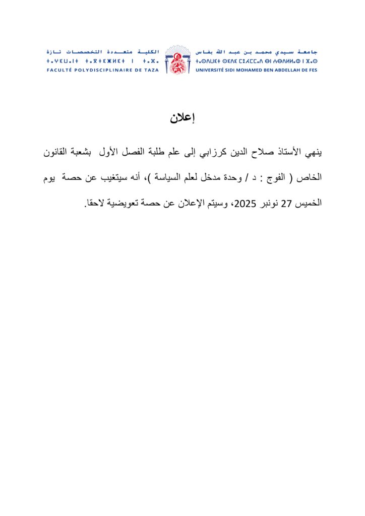 إعلان لطلبة الفصل الأول بشعبة القانون الخاص ( الفوج : د / وحدة مدخل لعلم السياسة )