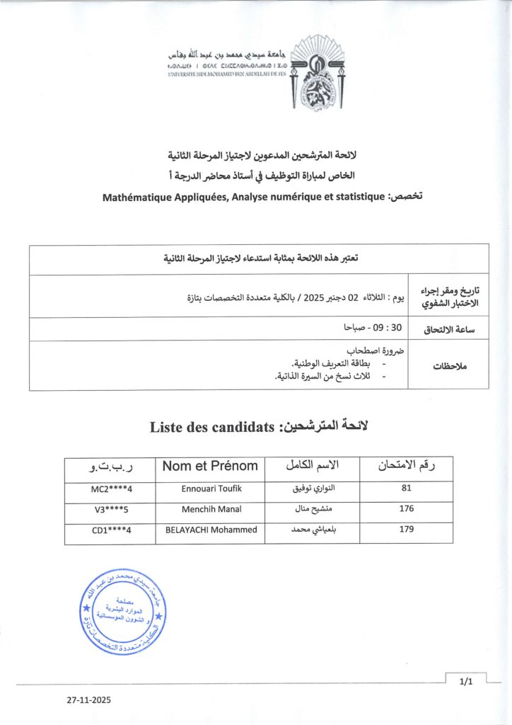 لائحة المترشحين المدعوين لاجتياز المرحلة الثانية الخاص لمباراة التوضيف في استاذ محاضر الدرجة أ تخصص Mathématique Appliquées, Analyse Numérique et Statistique