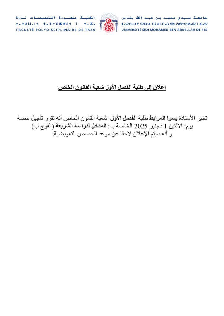 إعلان لطلبة الفصل الأول شعبة القانون الخاص – المدخل لدراسة الشريعة (الفوج ب)