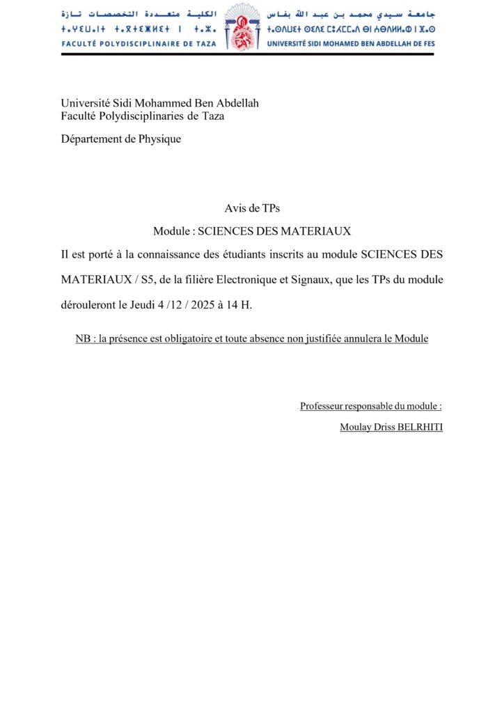 Avis de TPs aux étudiants de la filière Electronique et Signaux – module SCIENCES DES MATERIAUX / S5