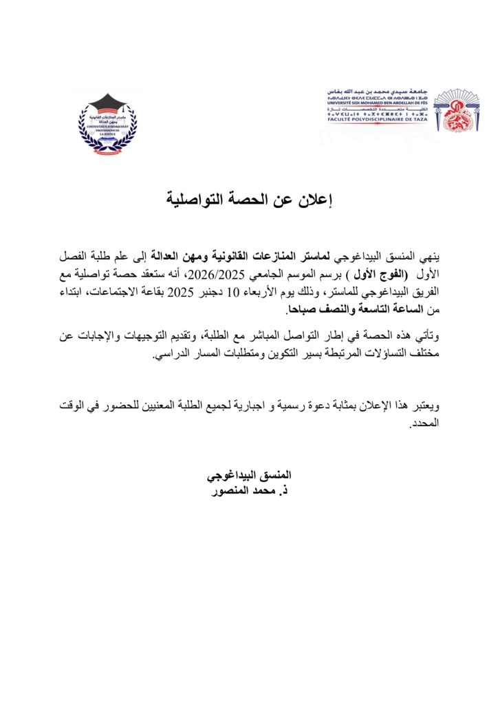 إعلان عن الحصة التواصلية لماستر المنازعات القانونية ومهن العدالة