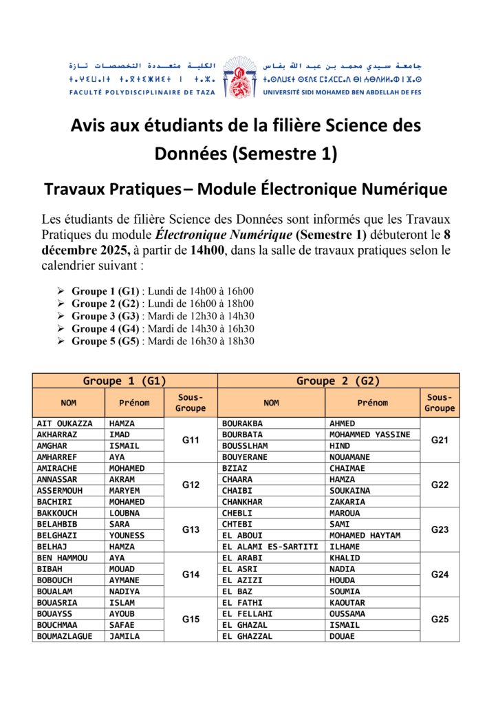 Avis aux étudiants de la filière Science des Données (Semestre 1) – Travaux Pratiques– Module Électronique Numérique