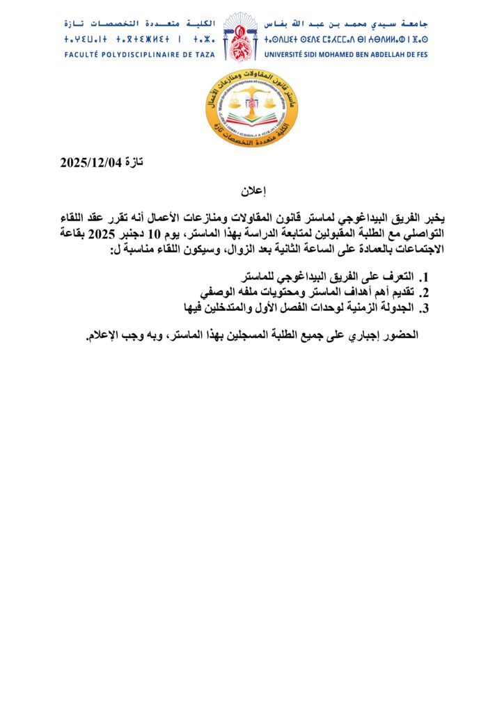 إعلان لطلبة لماستر قانون المقاولات ومنازعات الأعمال