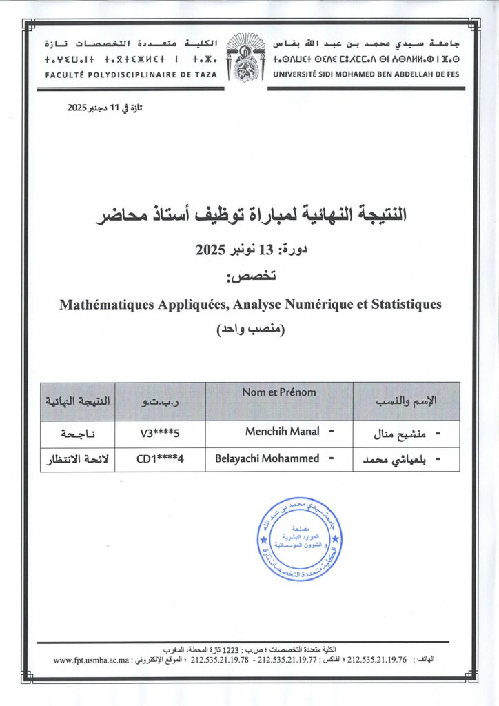 النتيجة النهائية لمباراة توظيف أستاذ محاضر دورة 13 نونبر 2025 تخصص Mathématiques Appliquée, Analyse Numérique et Statistiques