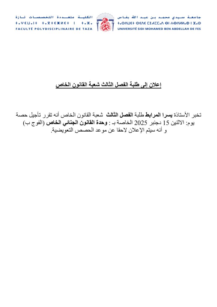 إعلان لطلبة الفصل الثالث شعبة القانون الخاص – وحدة القانون الجنائي الخاص الفوج (ب)