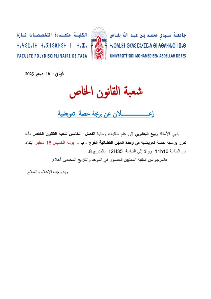 إعلان لطلبة الفصل الخامس شعبة القانون الخاص – وحدة المهن القضائية الفوج – ب