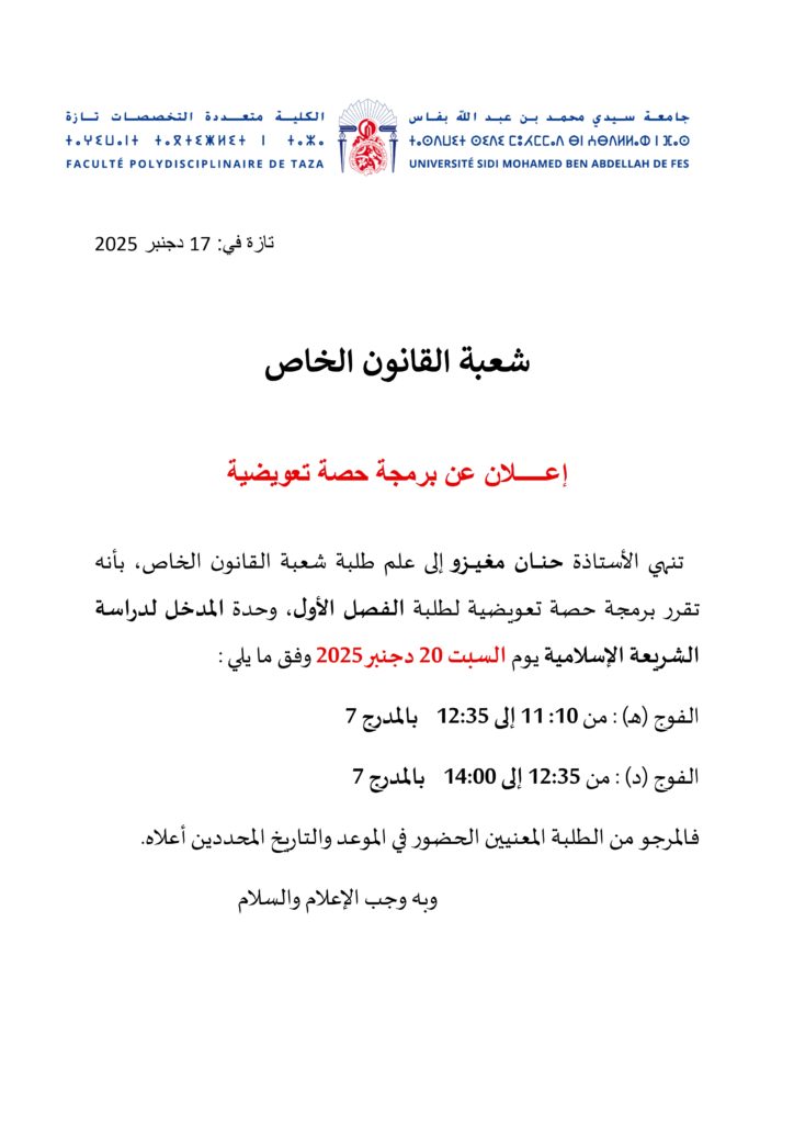 إعلان لطلبة الفصل الأول شعبة القانون الخاص – وحدة المدخل لدراسة الشريعة الإسلامية