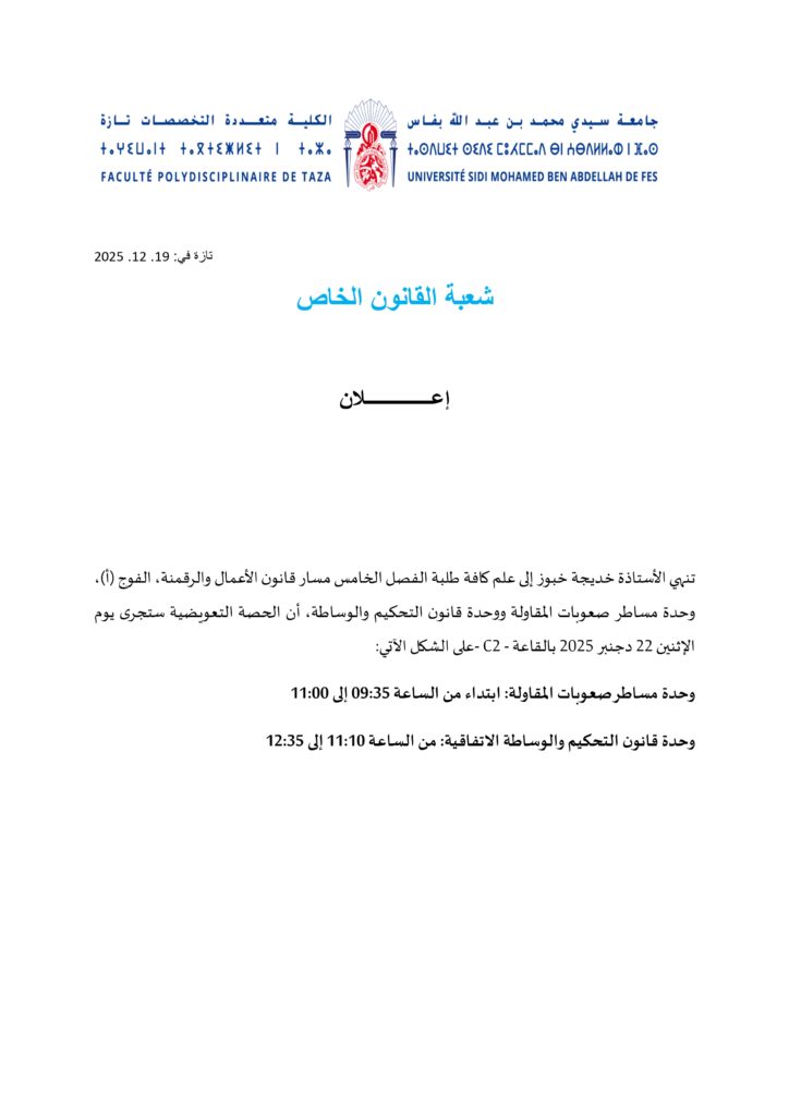 إعلان لطلبة الفصل الخامس مسار قانون الأعمال والرقمنة، الفوج (أ) – وحدة مساطر صعوبات المقاولة ووحدة قانون التحكيم والوساطة