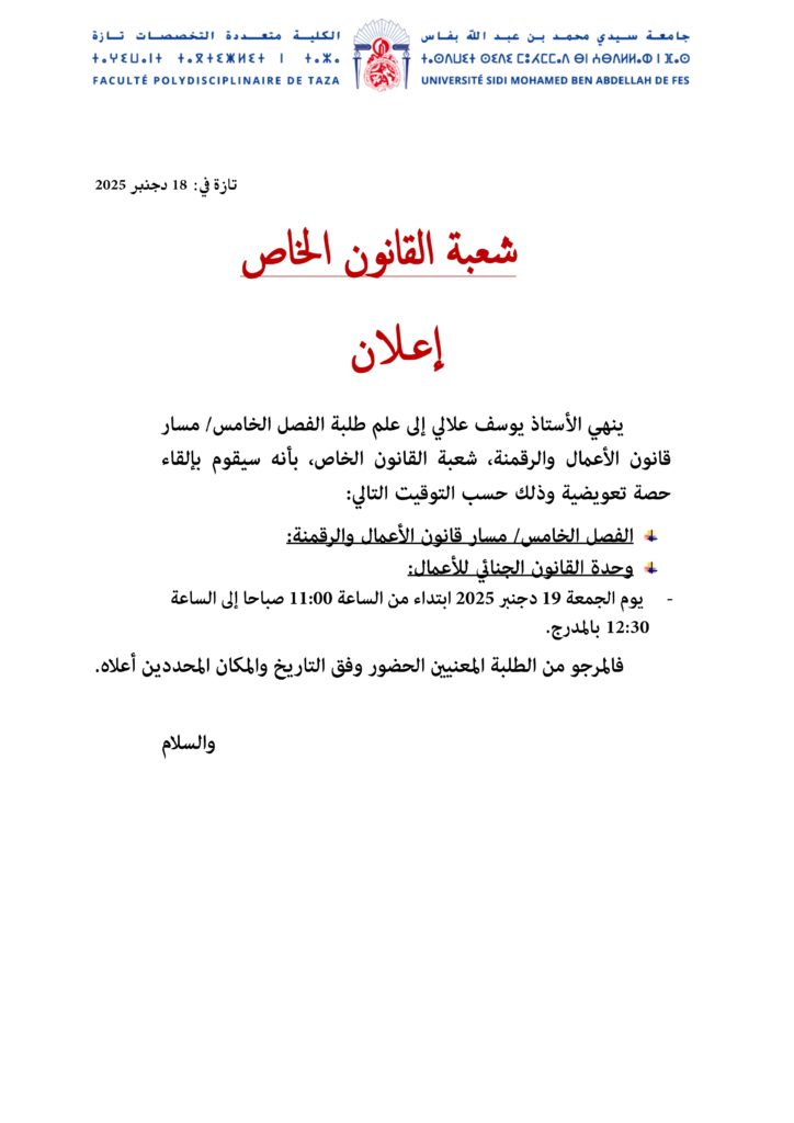 إعلان لطلبة الفصل الخامس /مسار قانون الأعمال والرقمنة – شعبة القانون الخاص – وحدة القانون الجنائي للأعمال