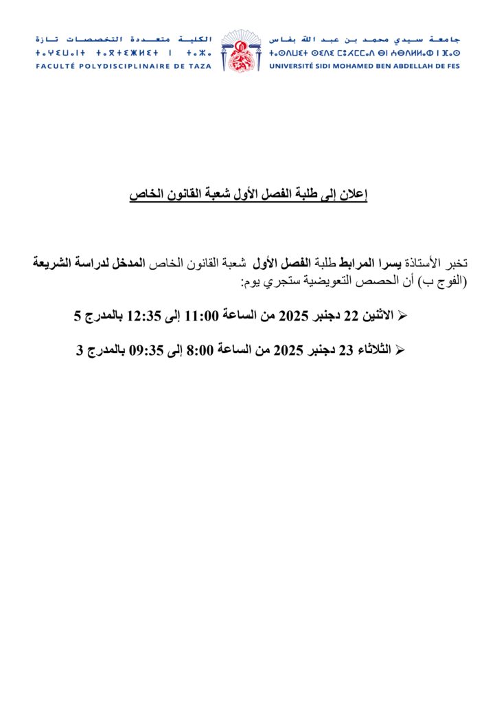 إعلان إلى طلبة الفصل الأول شعبة القانون الخاص – المدخل لدراسة الشريعة (الفوج ب)