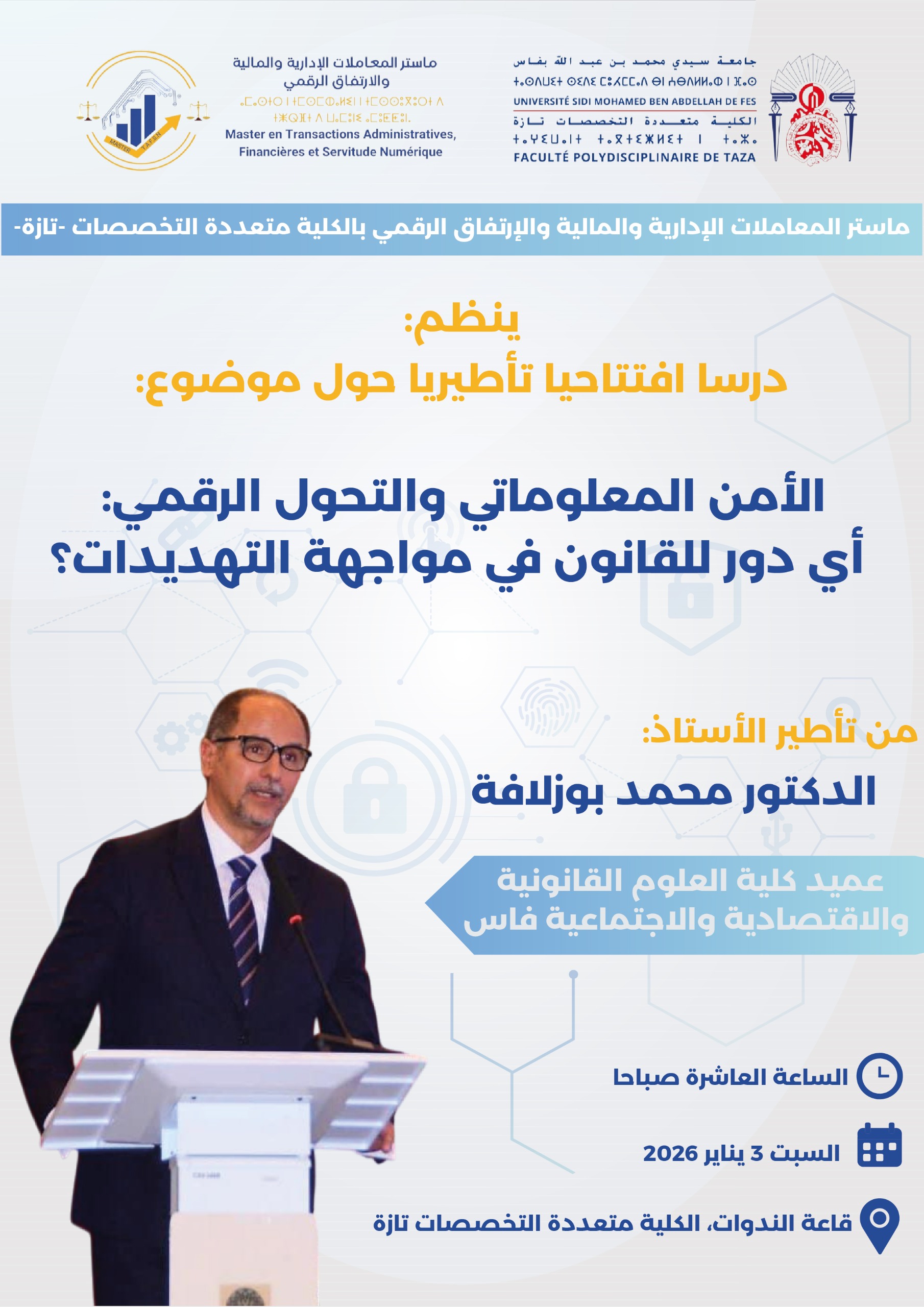 تستقبل الكلية متعددة التخصصات تازة يوم السبت 03 يناير 2026، ابتداء من الساعة العاشرة صباحا، الدكتور محمد بوزلافة عميد كلية العلوم القانونية والاقتصادية والاجتماعية فاس، وذلك لتأطير الدرس الافتتاحي لماستر المعاملات الادارية والمالية والارتفاق الرقمي،