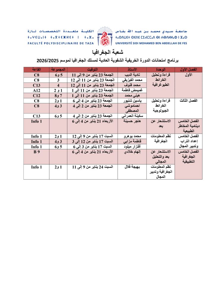 برنامج امتحانات الدورة الخريفية الشفوية العادية لمسلك الجغرافيا لموسم 2026/2025 – شعبة الجغرافيا
