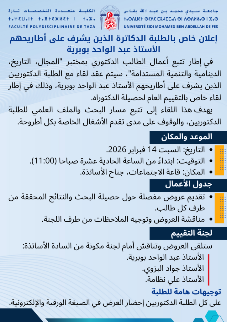 إعلان خاص بالطلبة الدكاترة الذين يشرف على أطاريحهم الأستاذ عبد الواحد بوبرية