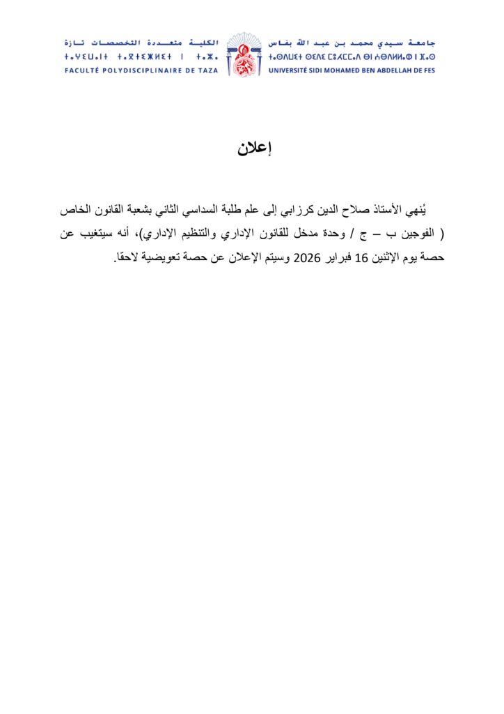 إعلان لطلبة الفصل السداسي الثاني شعبة القانون الخاص (الفوجين ب – ج) – وحدة مدخل للقانون الإداري والتنظيم الإداري