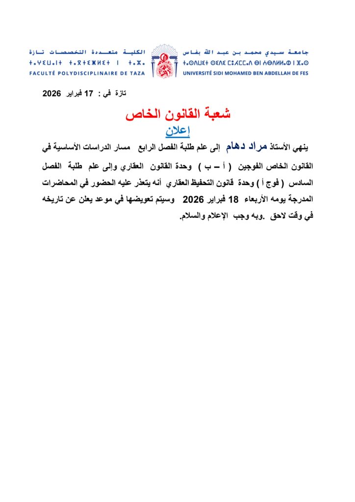 إعلان لطلبة الفصل الرابع مسار الدراسات الأساسية شعبة القانون الخاص الفوجين ( أ-ب ) – وحدة القانون العقاري – لطلبة الفصل السادس (فوج أ) – وحدة قانون التحفيظ العقاري